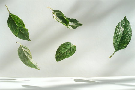 Green leaves on a white background. Minimal still life concept.