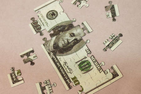 Financial concept. Budget like puzzle. Top view, on grey backdrop