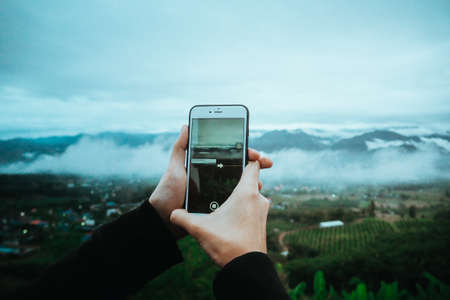A hand holds a mobile phone making a photo of a mountain landscape with lake