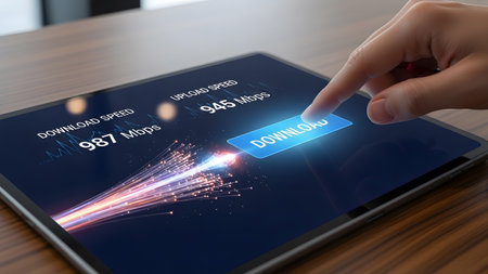 Download showing finger taps download button on tablet showing internet speed test with bright...