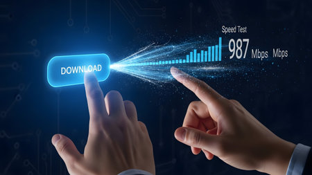Download showing hands pressing download button with speed test data showing 987 mbps download...