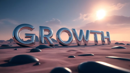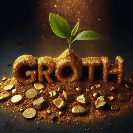 Typography Design of GROWTH Made of Gold Coins with Tree Sprout
