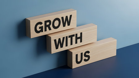 Growth and success concept. Business common goals and strategies. Hand puts wooden cubes with growth trend performance on grey background and copy space. Banner for new action plan ,goals, success.