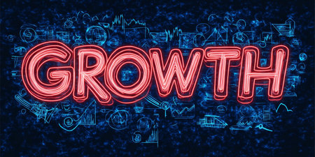 Red Neon Sign Glowing Text Growth on Dark Background with Business Icons, Concept of Progress