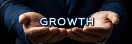 Two open hands cradle a glowing blue graph line ascending upwards, symbolizing progress and expansion.