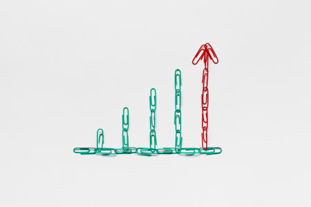 A graph moving upwards made with green and red paperclips on white background, shot from above.