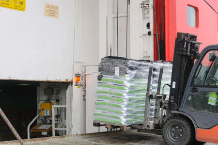 Forklift loading bulk cargo by forklift at the port.