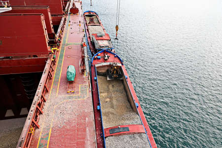 Loading bulk cargo of limestone from barges into a bulk carrier by using ship cranes and grabs at the port of Campha, Vietnam. October, 2020.