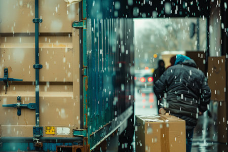 An abstract image of movers unloading boxes from a container truck in the rain.