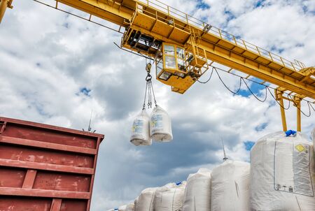 Cargo crane lifts two large bags of ammonium nitrate. Big yellow gantry crane.
