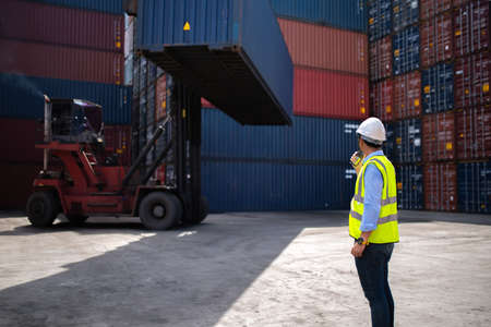 Foreman control loading Containers box to truck for Logistic Import Export Background, Business logistic concept, import and export concept