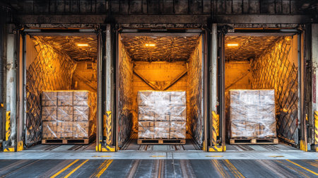 This image captures a bustling industrial scene with cargo trucks actively loading and unloading materials in a well-organized warehouse setting.
