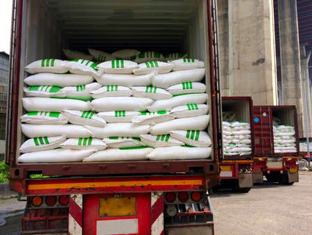 White sugar bags stuffing into a container for export isolated on white background. Distribution, Logistic Import Export, Trading, Shipment, Delivery concept.
