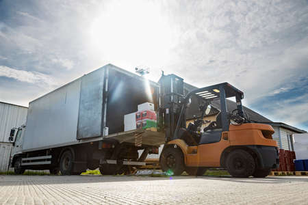 Worker driving forklift loading and unloading shipment carton boxes and goods on wooden pallet from container truck to warehouse cargo storage in logistics and transportation industrial