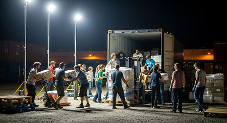 Volunteers unloading containers at night. Shipment for humanitarian aid delivery during global crisis. Distribution hub with people working to help others.