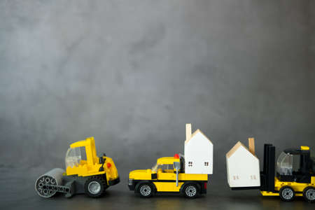Simply design red toy car and inscription DELIVERY word isolated on yellow colorful background. Internet shopping online purchase e-commerce packages delivery service concept. Copy space