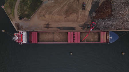 Aerial top down view of a ship and crane loading ground into a large freight ship. Excavator