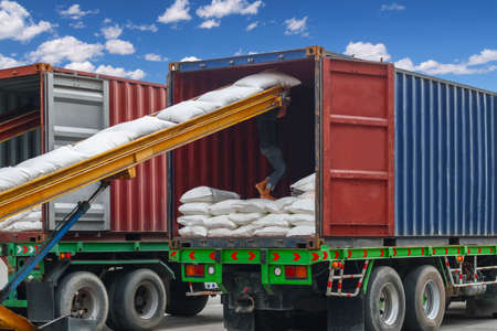 White sugar bags stuffing into a container for export isolated on white background. Distribution, Logistic Import Export, Trading, Shipment, Delivery concept.