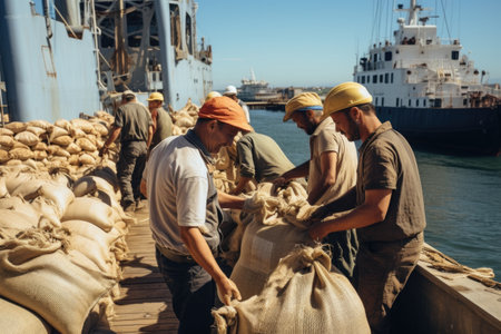 Workers engage in efficient cargo loading and unloading at a bustling port, with large shipping containers and machinery in the backdrop, capturing the essence of maritime logistics workflow.