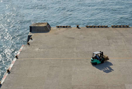 Worker driving forklift loading shipment carton boxes goods on wooden pallet at loading dock from container truck to warehouse cargo storage in freight logistics, transportation industrial, delivery