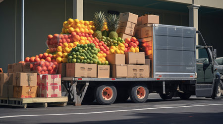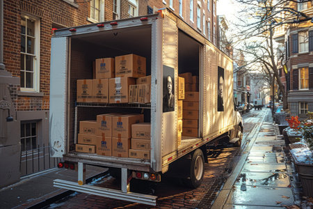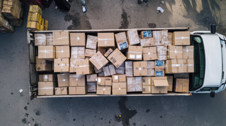 An overhead capture of a delivery truck filled with numerous cardboard boxes, representing the logistics, transportation, and shipping industry in an urban setting.