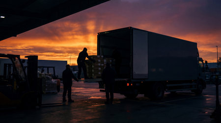 Workers efficiently load numerous express packages onto a delivery truck before dawn, their silhouettes defined against the dramatic, golden-hued sky.