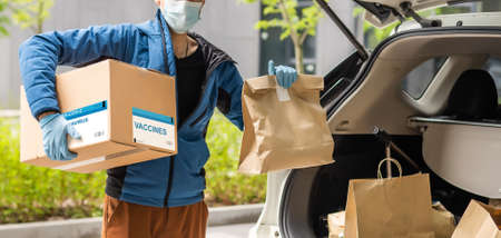 Asian delivery man courier moving deliveries out boxes in back car he protective face mask, service customer on front house under curfew quarantine pandemic coronavirus COVID-19, in car trunk view