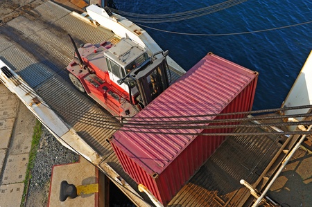 loader with container entering the oceanic ferry ship