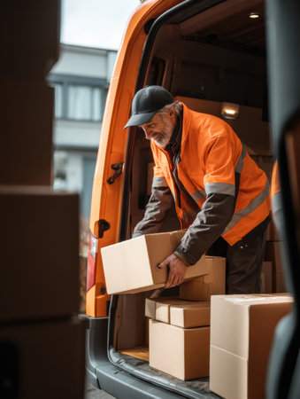 Courier efficiently loads multiple boxes into an electric cargo van, taking advantage of sunny weather while ensuring timely deliveries in the city.