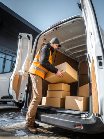 delivery worker loads boxes into van, transportation and logistics process in action, from warehouse to delivery, ensuring efficient shipping and supply chain operations. High quality photo