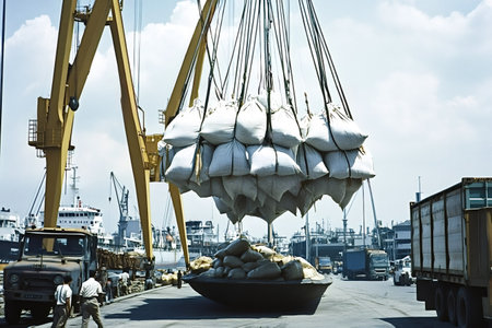 A crane effortlessly raises a hefty amount of cement at a bustling construction site, Ship crane lift-off slings of sugar bags cargo from truck and load into ship, AI Generated