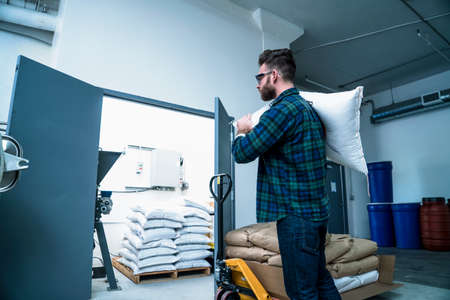 Truck driver unloading plastic bags from truck to warehouse. Logistics and transportation concept