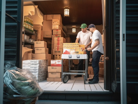 An engaging photograph of staff collaborating to arrange supplies for transport, capturing the teamwork involved in the wholesaling process. --ar 3:2 --v 6 Job ID: 38c01ca1-7e3c-4b33-91c0-1954a83a15b5