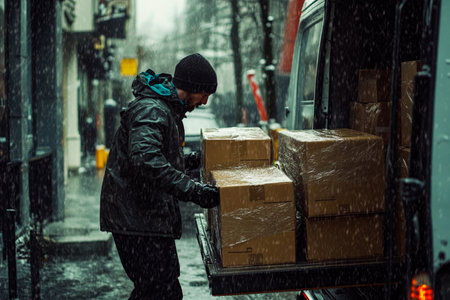 A delivery worker fogged with breath lifts sealed boxes from the back of a van on a snowy street. Flakes dance in the air as he braves the cold to fulfill essential deliveries.
