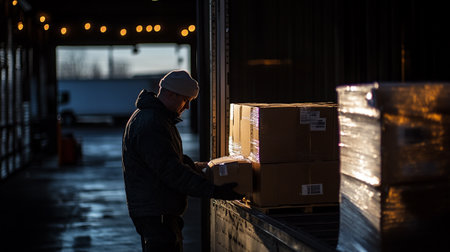 Male worker unloading boxes in warehouse at night. Shallow depth of field