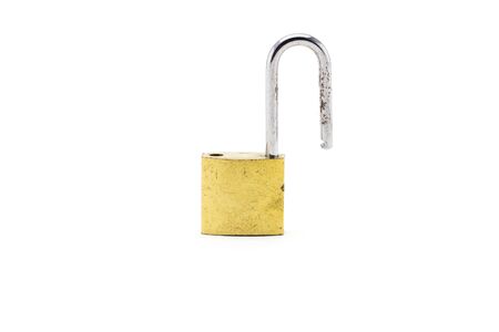 Unlocked Golden Padlock And Key Isolated On White Background, Closeup
