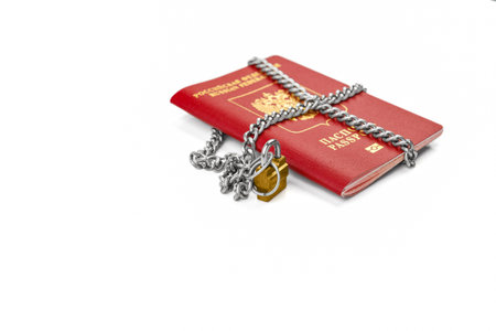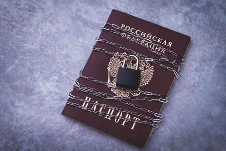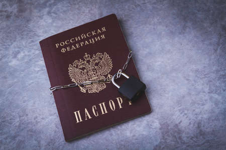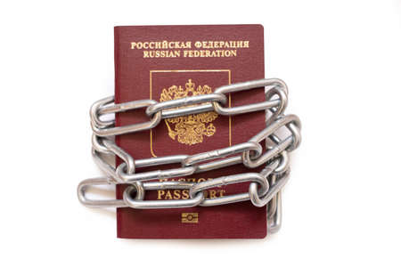 Russian foreign international passport in chain concept. prison. closed borders. sanctions. limit