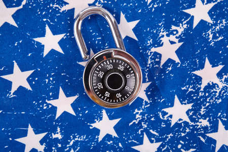 Concept Of Second Lockdown in US. Real padlock placed on top of the American flag to indicate second national lockdown in US due to rise in COVID-19 cases.