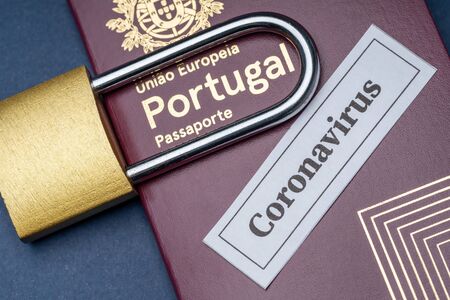 Portuguese european travel passport with padlock on blue background. Close-up. European Union