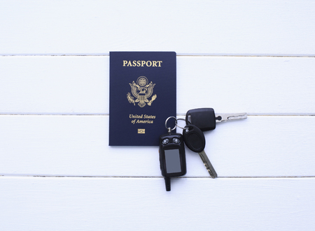 Bunch of different keys, passport and money on a wooden background. New housing, property and mortgage loan concept