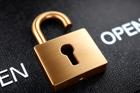 Gold open padlock resting on a textured black surface, symbolizing security, access, and data protection