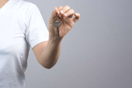 Woman hand giving keys on grey background