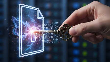 An ornate key is held by a hand, unlocking a glowing digital document filled with abstract data...