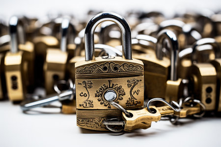 Vintage victorian style keys surrounding a single gold lock, symbolizing security, privacy, or protection.