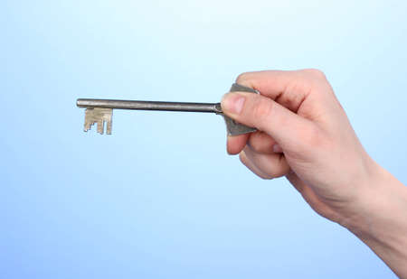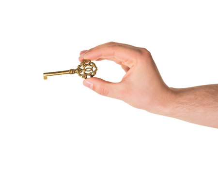 Outstretched woman hand with key on yellow background. Gives key to unlock secret of success