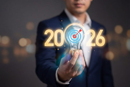 A professional businessman holds a glowing light bulb featuring a target icon inside to symbolize strategic achievement and future goals for the year 2026.