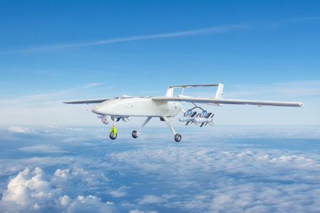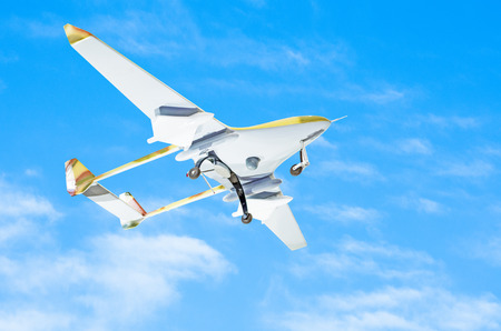 military UAV airplane flies against backdrop of beautiful clouds on blue sky background