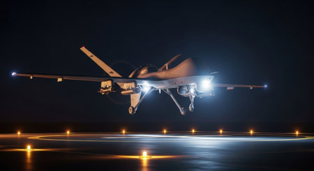 A military attack drone with landing gear deployed, illuminated by its own lights, hovering above a futuristic helipad at night. This unmanned aerial vehicle represents modern defense technology.