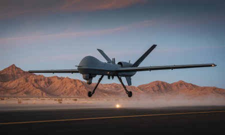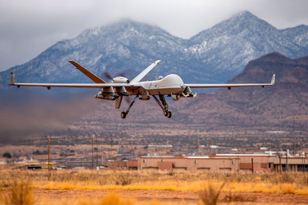 Grey military unmanned aerial vehicle descending for landing on a desert runway. arid mountains and clear sky in the background.