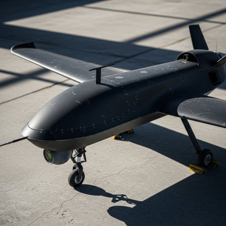 Dark operational surveillance drone resting on a weathered launch pad under harsh sunlight.